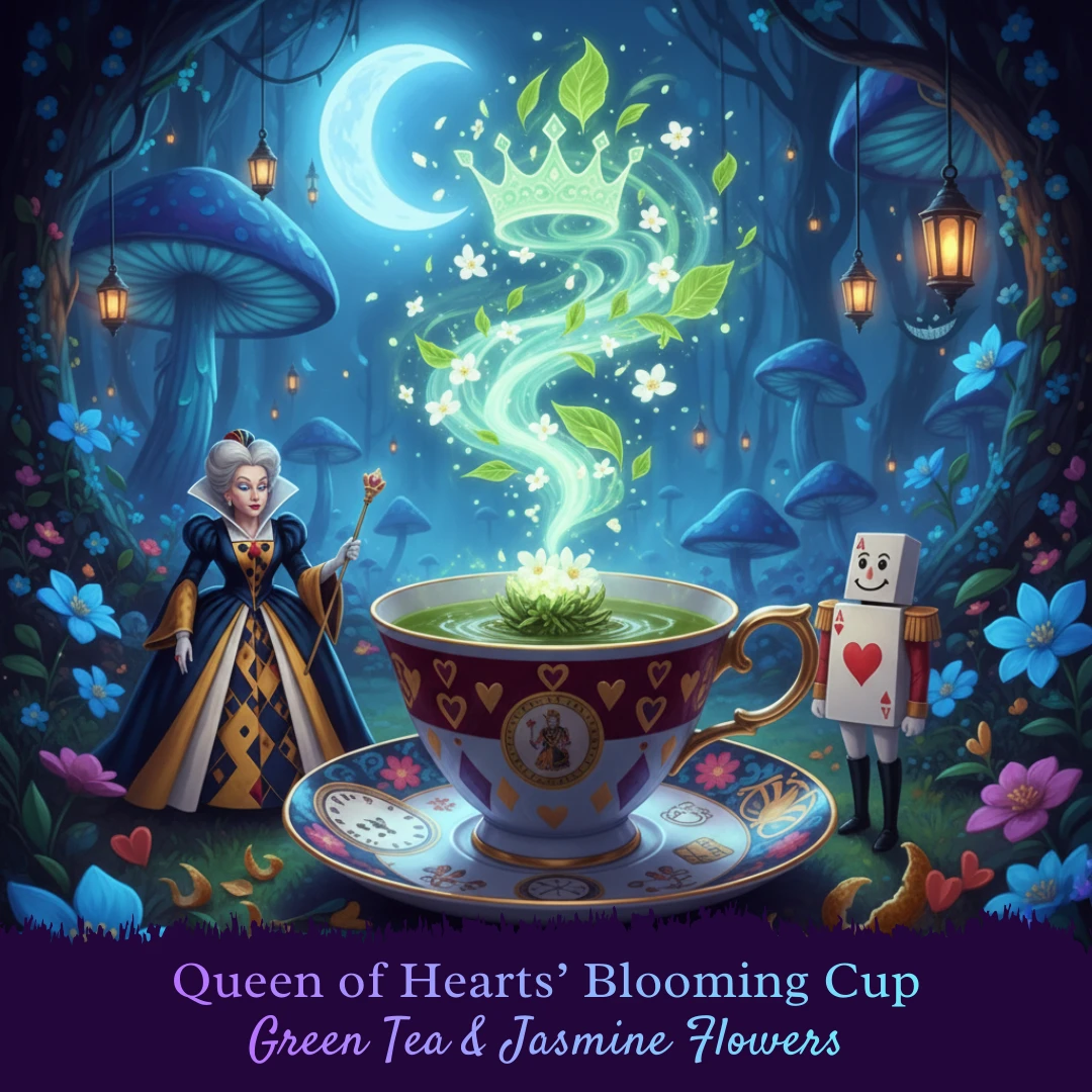 The Queen of Hearts may have been fiery, but her softer side blooms in this fragrant and calming tea. The smoothness of green tea meets the perfume of jasmine, creating a brew that’s light yet deeply satisfying.