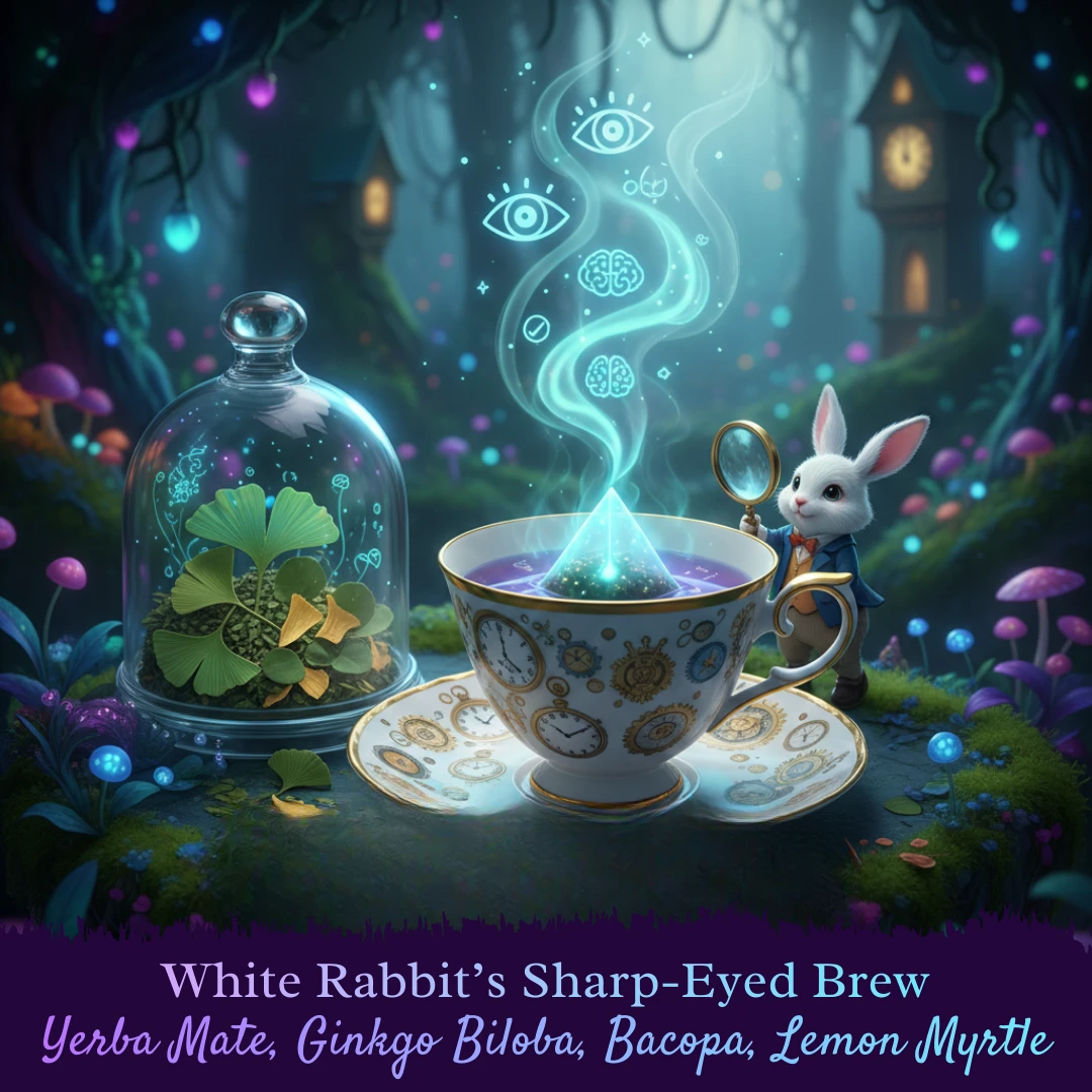 The White Rabbit is never late — and neither should your mind be. This blend pairs the natural vitality of yerba mate with ginkgo biloba, bacopa, and refreshing lemon myrtle to support memory, sharpen focus, and keep energy steady.